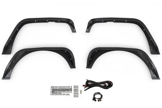 These fenders come equipped with a rubber seal to safeguard your vehicle's body panels, preventing the accumulation of dust and small debris at the seam. The front fenders feature a plug and play amber turn signal. A micro-texture black powder coat protects the fenders from the elements. Installation is fully bolt-on, but there is a cut & paint option, as described in the install guide, to get the cleanest look.