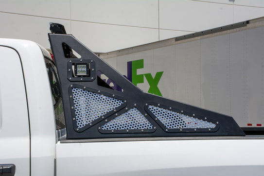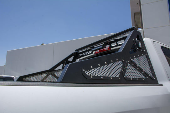 The DV8 2010-2018 Ram 1500/2500/3500 Chase Rack is a bolt-on rack that provides for extra lighting and mounting solutions for the bed of your Ram. This rack enhances the look of the truck and offers lighting options to increase visibility anywhere it is needed. 2 pod lights can be mounted on the sides of the rack, and a 50-inch LED light bar can be mounted on the top. The rack installs easily, is completely removable, and fits the OEM lines of the truck perfectly.