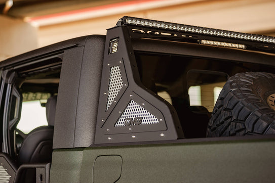 The DV8 Offroad Jeep Gladiator Chase Rack is a completely bolt-on rack that features multiple mounting options for lights. The rack bolts securely to the bed of the gladiator and completely enhanced the looks of the truck. This rack also features mesh aluminum accents that can be unbolted and color keyed to match your vehicle or theme. This rack features the option to mount a 50-inch light bar behind the cab where wind noise is much less of a factor than a standard windshield mount light bar.
