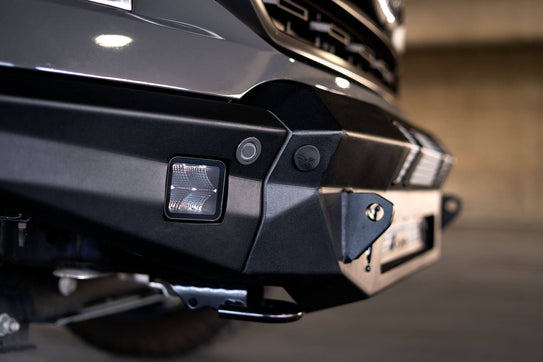 The MTO Series (Made to Overland) Front Bumper for the 9th Gen F-150 was designed with overland adventures in mind. At the center of the bumper are perforated aluminum panels that can be color matched or left raw aluminum. There are two mounting points for 3/4-inch D-ring shackles to provide recovery options. Sensor hole mounts accommodate the factory parking sensors. At each side of the bumper are mounting points for 3-inch pod lights for additional lighting on the trail.