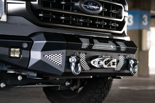 The MTO Series (Made to Overland) Front Bumper for the 9th Gen F-150 was designed with overland adventures in mind. The winch mount sits inside the bumper, which has access holes on top to reach the winch switch. It can handle up to a 12,000 lb winch. Surrounding the winch, are perforated aluminum panels that can be color matched or left raw aluminum. There are two mounting points for 3/4-inch D-ring shackles to provide additional recovery options. Sensor hole mounts accommodate the factory parking sensors.