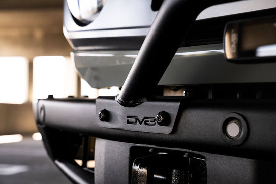 DV8 Offroad has designed a tubular bull bar for the Bronco’s factory modular steel bumper as an alternative for the OEM bull bar. It sits much lower in front of the grille than the OEM version, giving it a low profile appearance. The tube features 2 adjustable light mounts that allow for LED lighting to be mounted above or below the bar. Lighting options include mounting up to a 20-inch light bar above or below the tube, or an LED pod light on each of the 2 tabs.