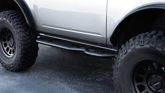 The OE Plus Side Steps for the 6th Gen Bronco were designed with performance and style in mind. These robust side steps enhance the look of your ride, while offering a safe and easy step up into the cabin. Their construction consists of sturdy steel tubes topped with steel plates that are textured similar to bike pedals, offering solid footing climbing in and out of your 2-Door Bronco.