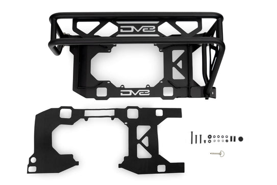 The Bronco Spare Tire Guard was designed with several functions in mind. After upgrading to larger tires, the spare tire has been known to cause flex in the tailgate due to the added weight on the factory carrier. The tire guard reinforces the tailgate by mounting to multiple points along the tailgate, increasing rigidity. Additionally, the guard can accept locking pins (not included) for security against theft.
