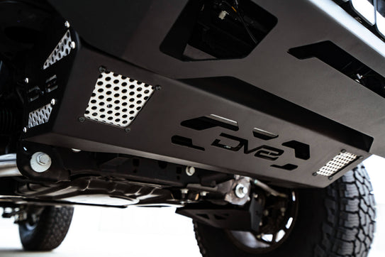 The DV8 Bronco Front Skid Plate was designed to work with both the original OEM bumpers or our aftermarket Bronco bumpers. If your Bronco has the factory plastic skid plate, this is the perfect upgrade to maximize the protection to the front undercarriage. It also protects the sway bar disconnect on the Badlands and First Edition trims. Made from 3.5mm Steel Plates & 5mm Steel Supports, it can handle anything the trail throws at you!