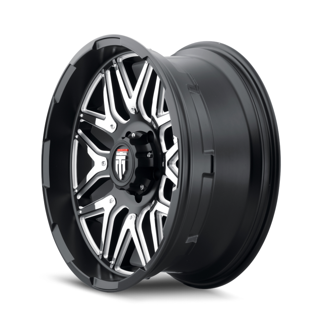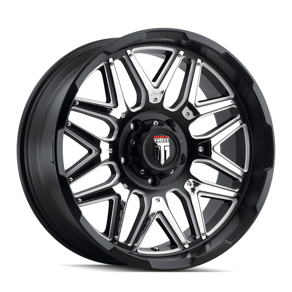 The spokes are split at the ends and meet in the center of the wheel. The wheel is then covered in a gloss black finish that is offset by the machined face. The center cap is adorned with the American Truxx logo to complete the look.