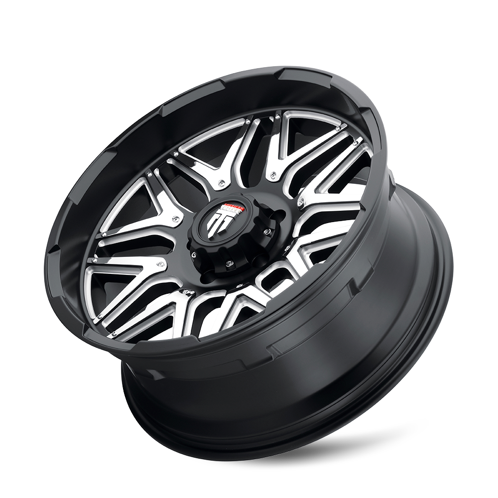 American Truxx Machined Gloss Black & Chrome Inserts AT-151 Grind Wheels feature a slightly convex face to emphasize the contoured wheel lip. The wheel has eight y-split spokes that are covered in chrome inserts. Mesh style wheels and large diameters are what American Truxx specializes in, and the AT-151 Grind puts those features on display.