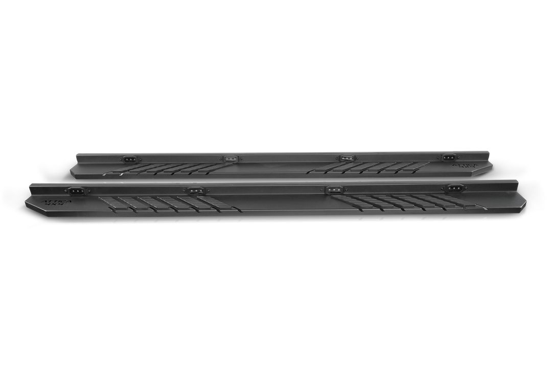 Stand out from the crowd with the rugged design of the Frontier Series Running Boards. Built with heavy-duty steel plate and body mount construction, these steps are made to last. The step surfaces feature rubber anti-skid plates, giving you added safety and grip when getting in and out of your vehicle, while also preventing the build-up of dirt, ice, and snow. Finished with a durable textured black powder coat, they’re built to withstand harsh conditions while resisting rust, and the laser-cut Attica 4x4 logo adds our signature brand touch.