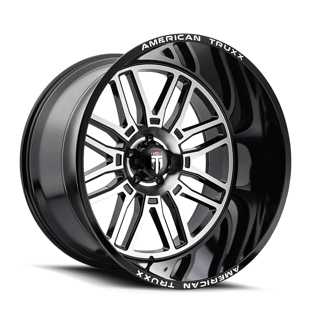 The wheel is covered in a gloss black finish that is enhanced by the machined face. The center cap is adorned with the American Truxx logo to complete the look.